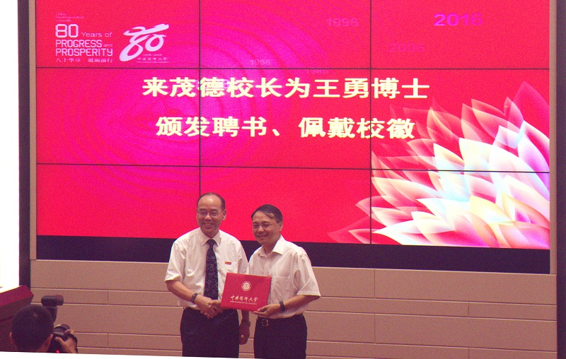 聘請儀式在中國藥科大學(xué)江寧校區(qū)經(jīng)管文樓111報告廳舉行,研究生院常務(wù)副院長邵蓉教授主持了此次儀式。人事處齊煉文處長宣讀了聘任文件,來茂德校長親自為王勇博士頒發(fā)聘書、佩戴?;?。